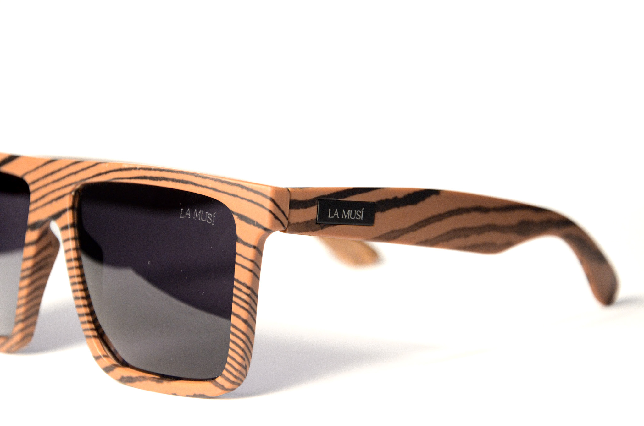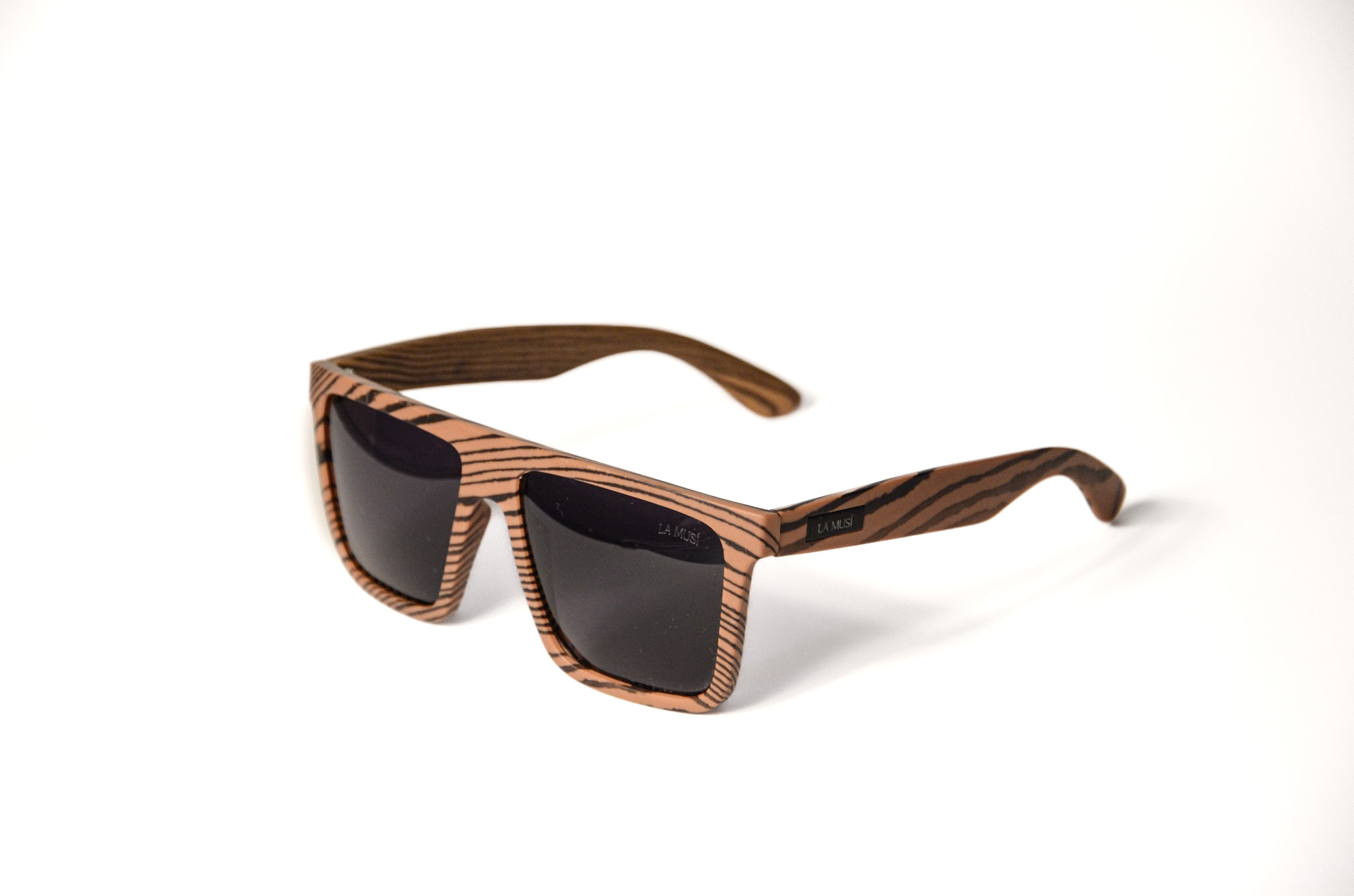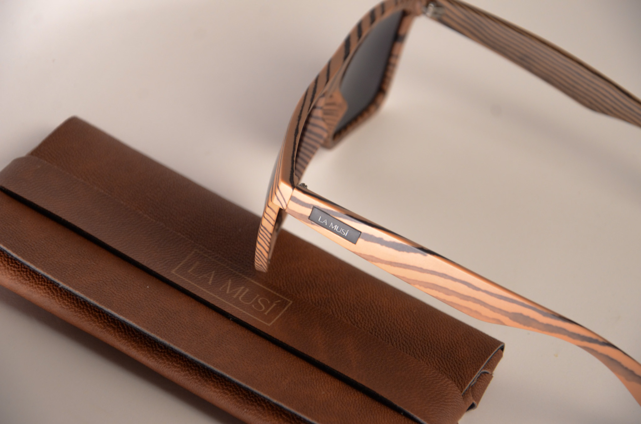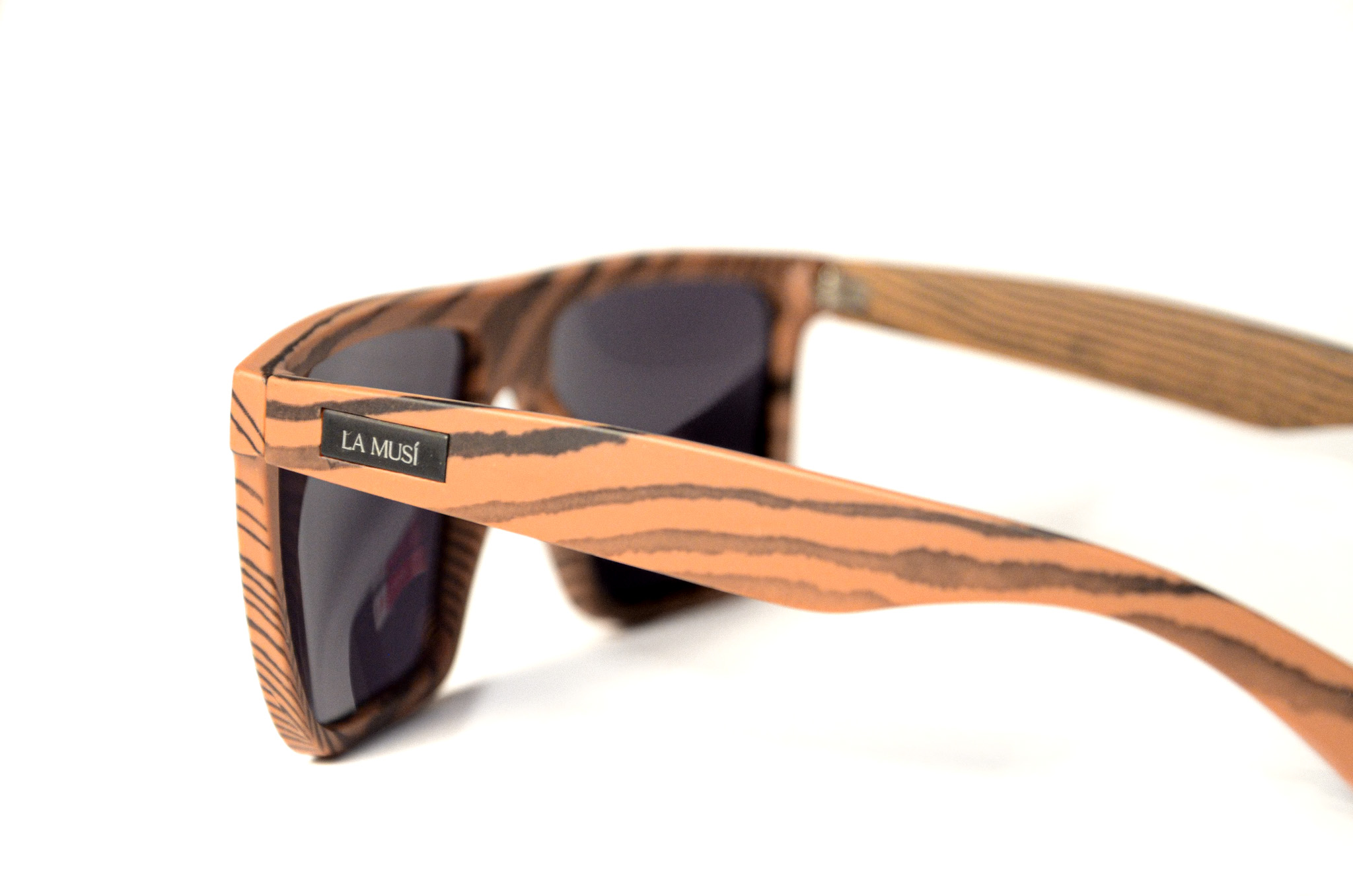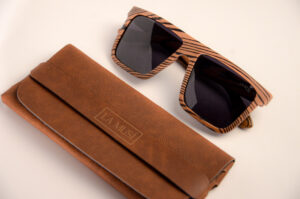 Um óculos em tons de madeira com detalhes, ecoando a serenidade e a conexão com a natureza da música “Natural Mystic” de Bob Marley.